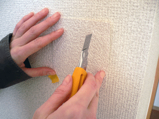 補修用壁紙を重ねて、先ほど剥がした枠よりひと回り大きくカットします。