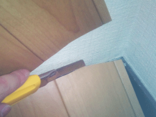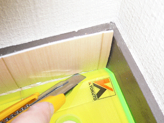 地べらでしっかり押さえて、壁際ぴったりにカットしていきます。