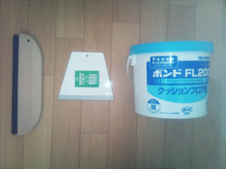今回使用したクッションフロア用ボンド・櫛目ゴテ・撫ぜバケです。