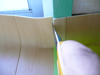 ここは慎重に合わせながら、余分なクッションフロアをカットします。