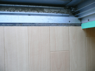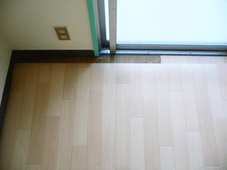 掃き出し窓の縁は、サッシの木枠?に合わせてクッションフロアのエンドを